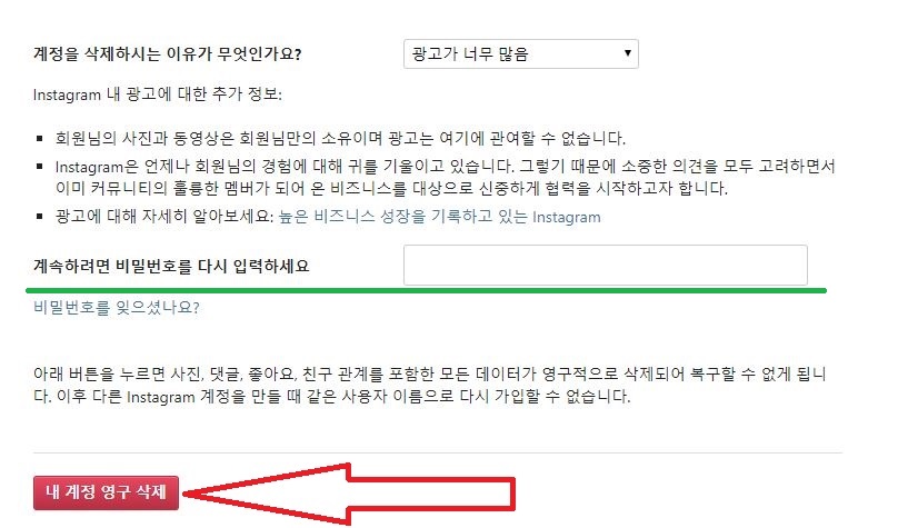 6) 이유 선택 후 비밀번호를 다시 입력 후 내 계정 영구 삭제를 클릭해주세요