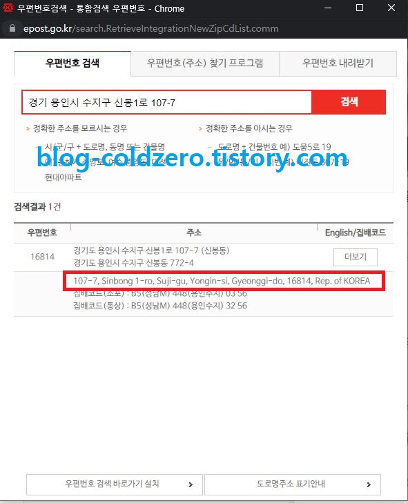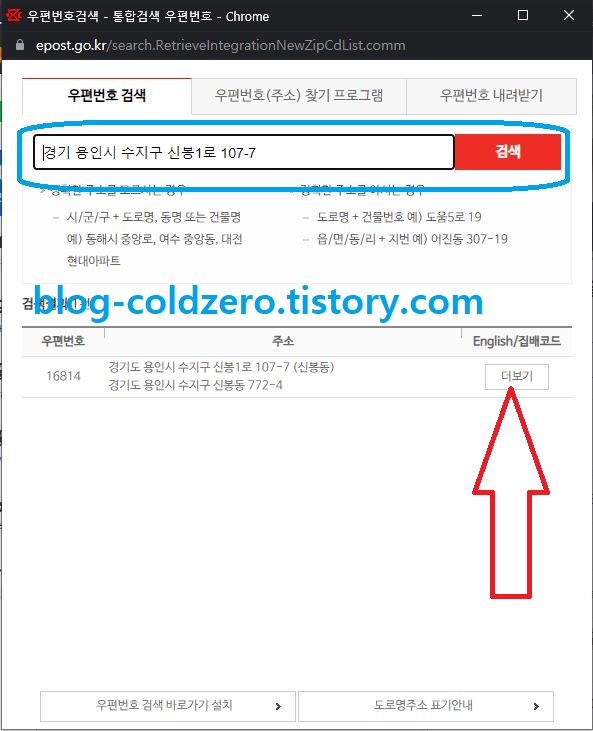 3] 주소 입력 후 검색하면 옆에 "English/집배코드" 더보기를 눌러주세요