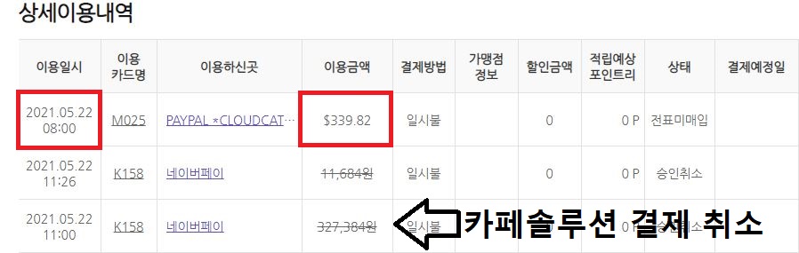 저는 페이팔로 국민 신용카드로 결제를 진행했습니다. 결제 시간 5월 23일 00시 였습니다. 처음에 385,831원($339.82) 나오더군요