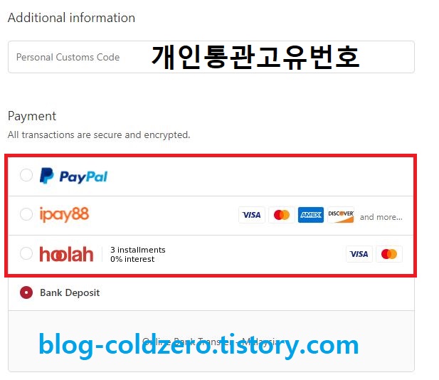 5] 개인통관고유번호 기입 후 결제 수단 선택 ( *개인통관번호 없을 시 발급하는 방법 검색하시면 많이 나옵니다)